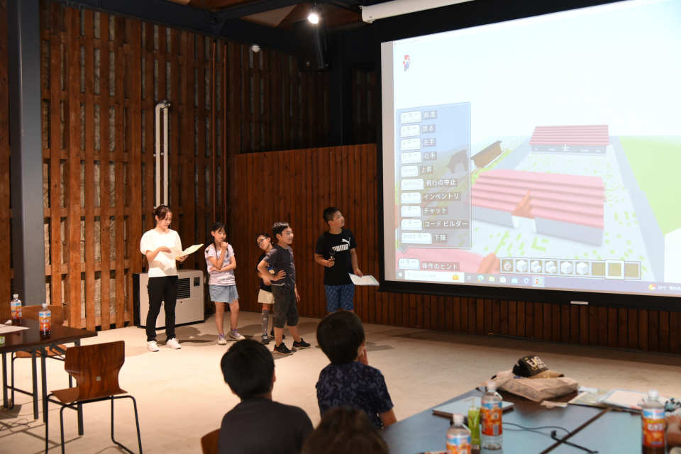 午後は、マインクラフトを活用し未来のニセコ町を各々思い描いたものをグループ毎に作成し発表しました。