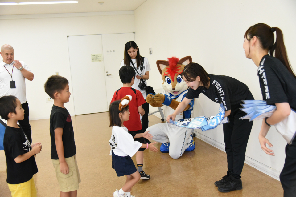 Together with the Fighters Girls and the mascot character, Frep, we danced the Fox Dance, YMCA Dance, Genghis Khan Dance, and other dances that are performed between innings during games. We were able to learn dance from the Fighters Girls and had a very valuable time.